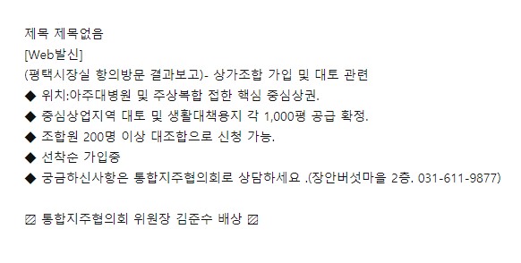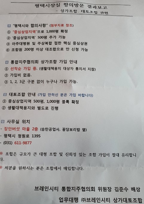 상식적으로 이해가 가지 않으서 여기에 이의 제기를 합니다. 어떤조합에서 조합가입예정자들에게 문자와 유인물을 보내 조합원 200명이상이 대조합이 아니면 상업용지를 받을수 없다고 했는데..본인들 조합이 평택시와 합의를 했고 중흥건설에서 직접 나와 약속을 했다는데 사실인지요? 다른조합은 상업용지 못받나요? 기회를 다같이 주고 같은 정보를 주어야지 어떤 조합에만 직접 나가서 저런 약속을 해주고 특혜를 준다는것이 말이 안되는것 같습니다. 사실여부의 답변을 원합니다.
