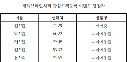 평택브레인시티 4차 관심고객등록 이벤트 당첨자를 발표하겠습니다.